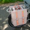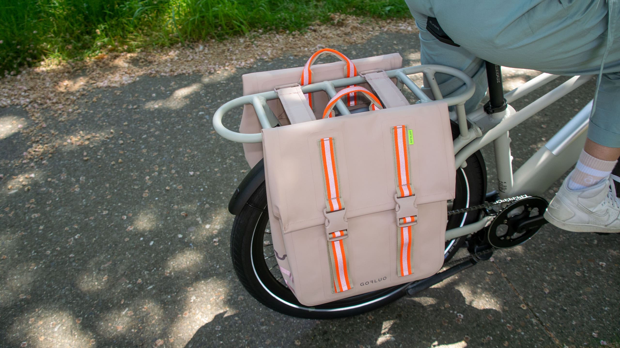 This double bicycle bag is crafted from a waterproof fabric and finished with taped seams to keep your belongings protected from rain. Inside is a small zip pocket to store your keys or wallet. Thanks to its narrow shape, this bag is also suitable for electric bikes.